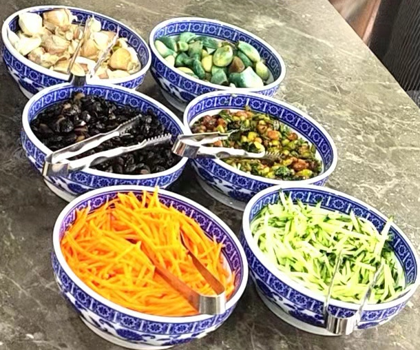 -腌蒜、生蒜、老虎菜、黃瓜絲、胡蘿卜絲、土豆絲、豆腐條-