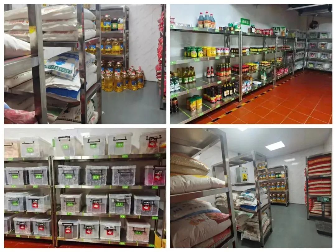 在濱西辦公區(qū)的倉庫內(nèi),一排排、一層層碼放整齊的調(diào)味品、米面油等食材,仍保持著天天有更新、日日有補(bǔ)充。