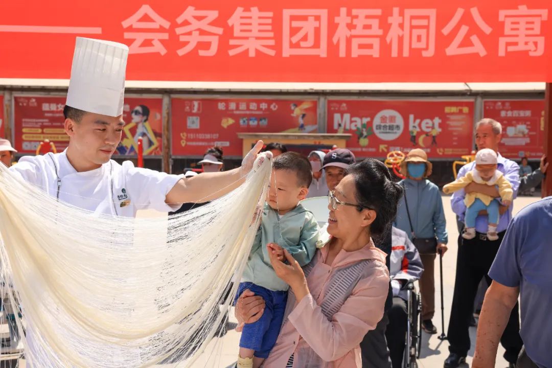 會務(wù)集團(tuán)梧桐公寓廚師現(xiàn)場展示龍須拉面絕活,達(dá)16384根。