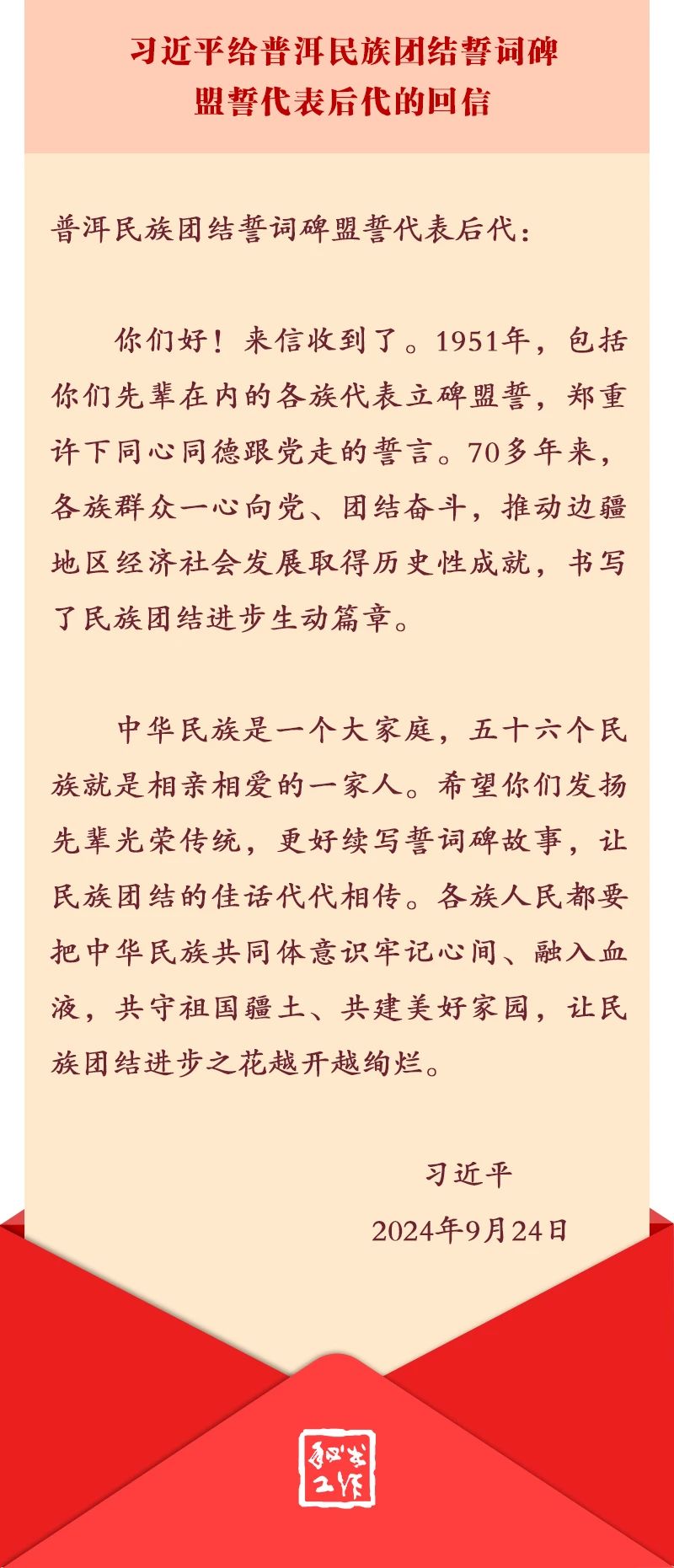 習(xí)近平強(qiáng)調(diào),中華民族是一個(gè)大家庭,五十六個(gè)民族就是相親相愛的一家人。希望你們發(fā)揚(yáng)先輩光榮傳統(tǒng),更好續(xù)寫誓詞碑故事,讓民族團(tuán)結(jié)的佳話代代相傳。各族人民都要把中華民族共同體意識(shí)牢記心間、融入血液,共守祖國疆土、共建美好家園,讓民族團(tuán)結(jié)進(jìn)步之花越開越絢爛。